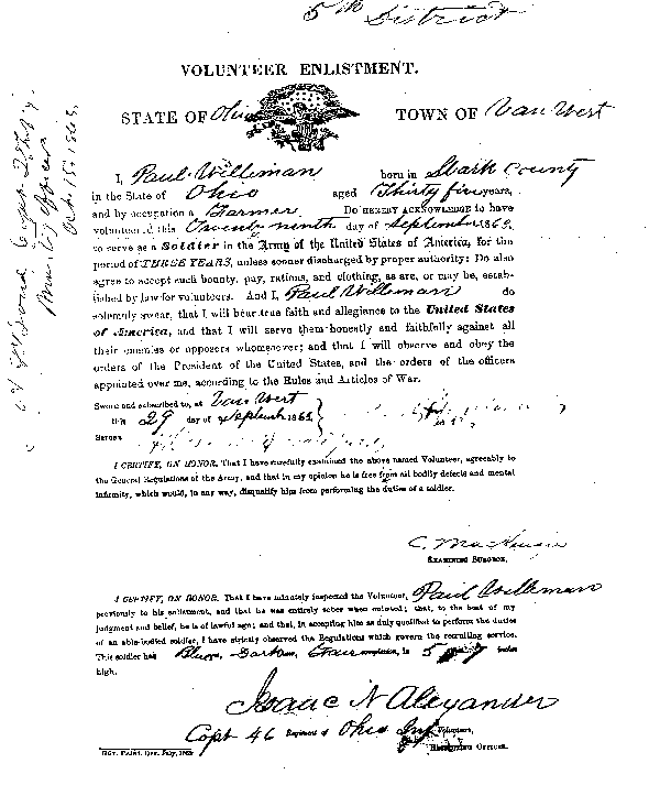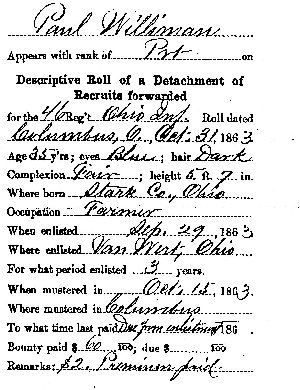 children: Eliza, William and Lucy. Four died young. Her first child, John Jacob was listed as living on July 29, 1864. Anna was 40 years of age when she bore her last child. of the Civil War. Here we add some additional details. We wonder what motivated Paul Williman to enlist in the Army for a three year term of service on September 29, 1863. He was 35 years of age. Having married at the age of 20 did he feel he had missed out on the excitement of his youth? He had registered for the draft but may not have been called. Did he choose to enlist rather than wait to be drafted because be would be paid $60 as a bounty and $2 as a premium for enlisting? Was this a chance to see other parts of the US that he could not afford to travel to? Or, was theirs an unhappy marriage and this was a way to escape? We can only wonder. Paul's enlisting must have been very difficult for Anna. She and Paul had a hard life. With only a small farm it was a trial to make a living. They had been faced with a lot of sorrow in that four of the seven children born to them had died. Now Anna was six months pregnant with her eighth child when Paul enlisted. How did Paul expect Anna to manage the farm while he was in the Army? Their oldest son, John Jacob was 14 years of age and was probably considered old and strong enough to do the farm work. (He did not die in infancy), Baby Lucy would never see her father. Then, too, Anna did not have any of her relatives close by to give her support. Her marriage outside her church cut her off from the rest of the family at the time of her marriage. It is doubtful that there was any communication with them. If she could not sign her name, she could not write a letter. Paul enlisted in Company K, 46th Regiment of Ohio Volunteers under Captain Alexander and the command of Colonel Wolcott. He was mustered into service in Columbus, OH on October 15, 1863. Opposite is a record of his enlistment. By May of 1864 the Army of the Ohio in which Paul Williman was serving had entered Georgia and it was one of three armies commanded by General Sherman. The largest of the three was the Army of the Cumberland made up of 60,000 men led by Thomas. The next in size was the |