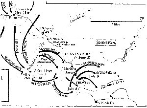 3.000 men killed and wounded. The Confederates lost around 500 men in that battle. Realizing that a frontal attack would be too costly, Sherman ordered his men to discontinue the attack and attempted another flanking movement that forced Johnston to remove his men from Kennesaw Mountain to the village of Smyrna, five miles southeast. General Howard reflected on the battle at Kennesaw Mountain: "We realized now, as never before, the futility of direct assaults upon entrenched lines already well prepared and well manned." Paul Williman was one of the casualties that taught the Yankees that lesson. A record in the Company Descriptive Book has this record of his death, "Killed instantly by a piece of shell while charging on the enemy at Little Kennesaw Mountain June 15,/64." (1864) ![]() A Casualty Sheet made some years later gives his place of death as Noon Day Creek. This was near by but not likely the actual place. The map below shows the movement of the Union armies in the area of Kennesaw Mountain. ![]() From James M. McPherson. Battle Cry of Freedom. Oxford University Press, 1988. p. 46. |