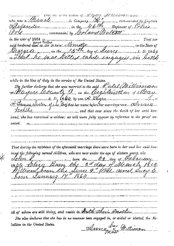 The application for a pension made by Anna Williman. Note that she made an X for her signature at the bottom of the page. Note also that she names four children that were born to her and Paul. The record states that Paul was killed near Merietta (Marietta), Georgia. Kennesaw Mountain is just north of Marietta. ![]() |